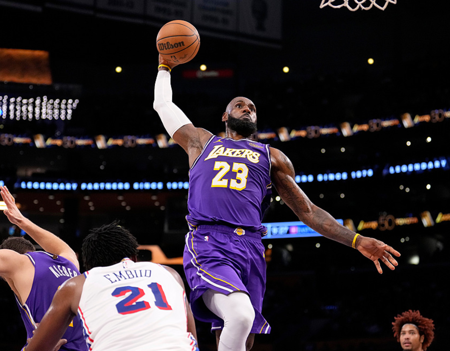 是什么纪录呢?北京时间2026年2月6日,30胜19负的湖人主场迎战29胜21负的76人,此战东契奇打了16分钟伤退,76人前三节压制湖人,一度领先14分,三节战罢领先2分。第四节里夫斯、詹姆斯携手爆发,里夫斯开局独得8分,带领湖人反超6分,随后詹姆斯不断得分,扩大优势,湖人一度领先16分,不过76人很顽强,一度把分差追到2分,但功亏一篑,湖人最终119-115击败76人。詹姆斯第四节得到10分,里夫斯第四节得到13分。